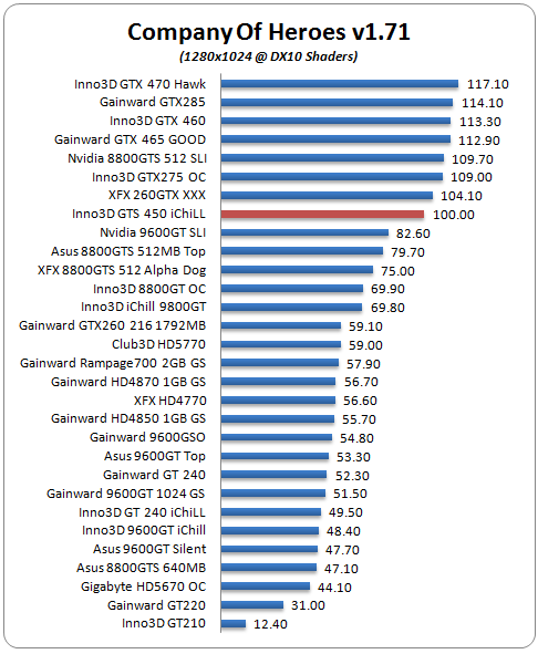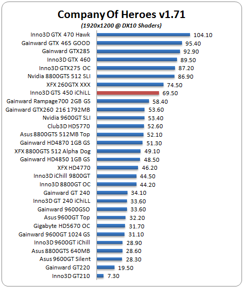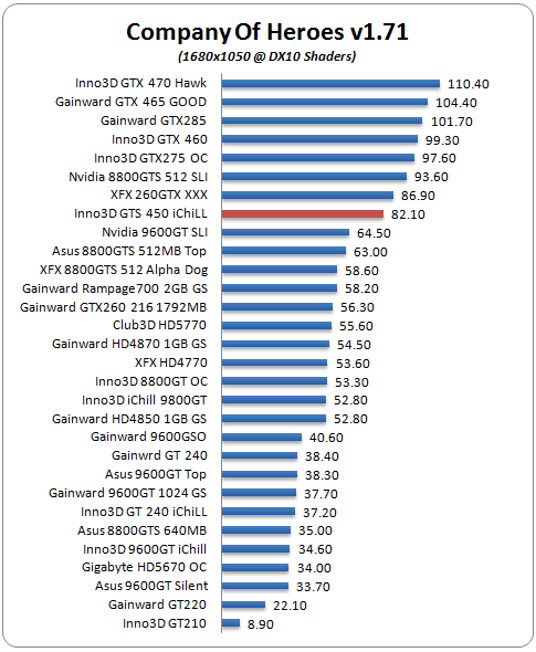 The "Company Of Heroes" is a popular action/strategy game with many funs around the world. The game was the first ever to utilize DirectX10 and features great in-game physics. For this test, we used the maximum quality settings and measured the performance (FPS) of each card.
