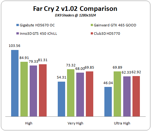 The Inno3D GTS 450 iChiLL seems to be ~5FPS slower than the HD5770 under DX9 for all the resolutions. However, as the quality settings become more demanding ("Ultra High") this difference in the FPS is smaller.