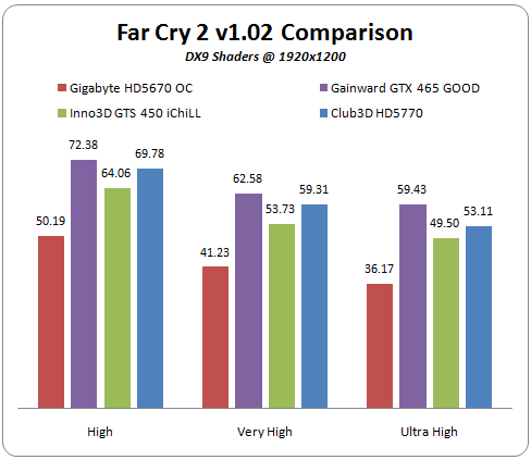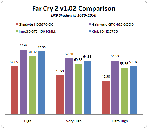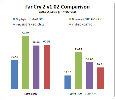 Enabling DX10 shaders and the "Ultra High" quality settings resulted to an equal performance for the Inno3D GTS 450 iChiLL and the HD5770. The GTS 450 iChiLL will give you a small advantage (~6FPS) with the antializing enabled: