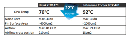 The above chart illustrates the cooling performance of two Inno3D GeForce GTX 470’s - one is equipped with the reference cooler and the other one has the triple fanned Hawk on board. Both cards were tested under the same platforms enduring full load testing . Clearly the Hawk cooler performed 24% better than the reference cooler with the reference showing signs of stress at 92°C.