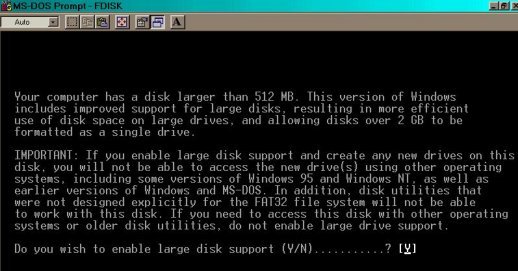 Answering Yes will create a 32bit FAT (File Allocation Table). FAT 32 will support partitions sizes up to two terra bytes. If you answer No, a 16bit FAT will be created which allows for only two GB partition sizes. Once you answer Y or N the next screen displayed is the fdisk main menu.
