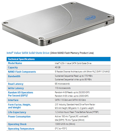 The 40GB Intel X25-V complements Intel?s higher performance Intel X25-M Mainstream SATA SSD product line that offers 80GB and 160GB capacities. All Intel SSDs are designed and manufactured by Intel using its own NAND flash memory from IM Flash Technologies (IMFT) and include a proprietary controller and updatable firmware. The X25-V is priced at $125 for 1,000-unit quantities and is currently stocked and available in worldwide distribution.