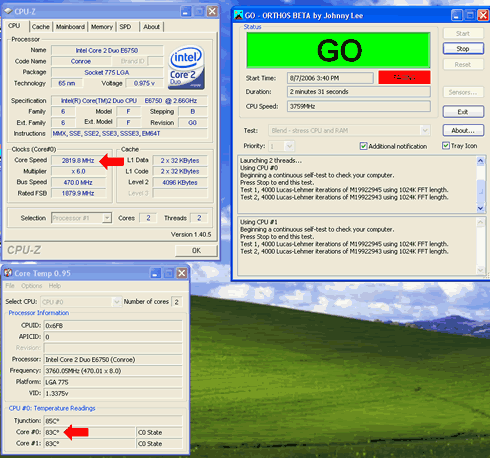 The temperatures were above 80° C resulting in an automatic reduction in CPU speed in order to avoid burning the processor. According to the specifications for an Intel Core2 Duo Desktop Processor E6750, the thermal specifiaction temperature is given as 72° C.