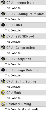 The "PassMark rating" is a weighted average of all the other test results and gives a single overall indication of the computer's performance. The bigger the number, the faster the computer. The "PassMark rating" can only be calculated if the results from all other tests are available. The value is calculated as follows.