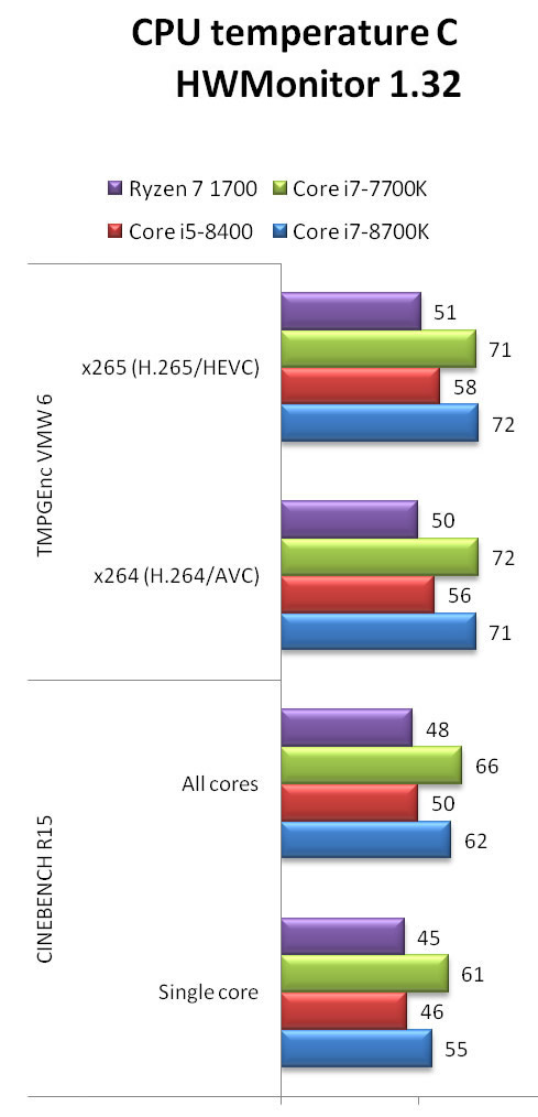 The Core i7-8700K reached the 72 degrees C in during some benchmarks, close to the temperature of the Core i7-7700K. The Core i5-8400 was TDP 90W so it runs significantly cooler than the rest CPUs.