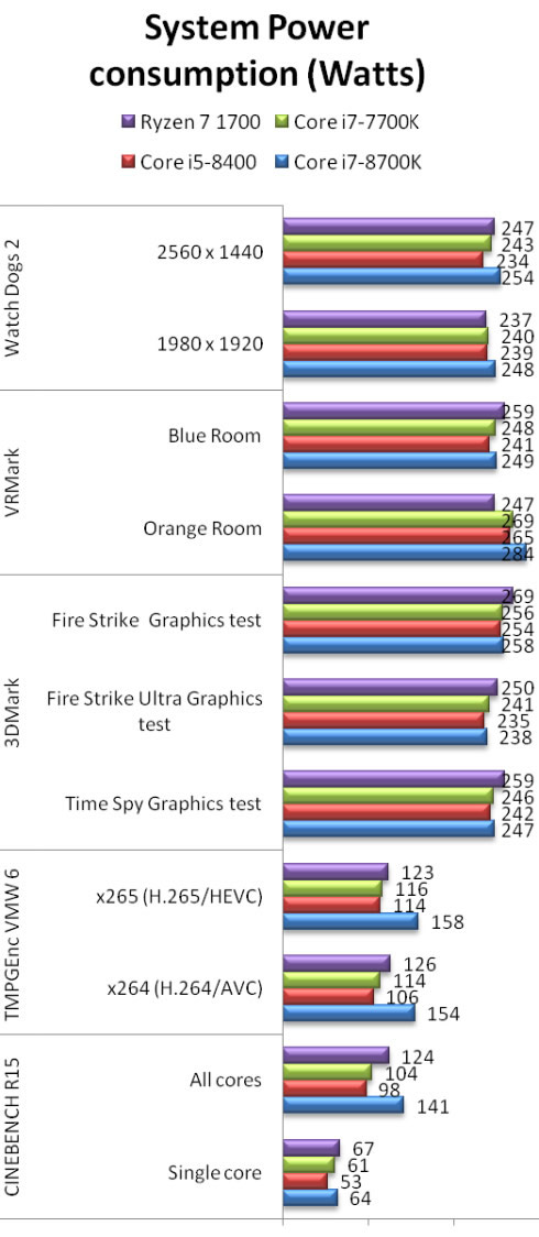 In an idle state, we measured a 35W power consumption for all the Coffee Lake-S CPUs. This value is lower than the 45W and the 37W we measured for the Ryzen 7 1700 and the older Core i7-7700K processors, respectively. But since we are measuring the total system power consumption of each system, this power difference could be attributed to the different motherboard we used for the AMD Ryzen 7 1700 test.
