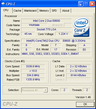 Using the latest CPU-Z we can see more details about the installed processor. The CPU multiplier is highly configurable (6~10x ) allowing us to feel that this processor would have wide overclocking margins.