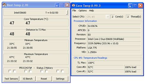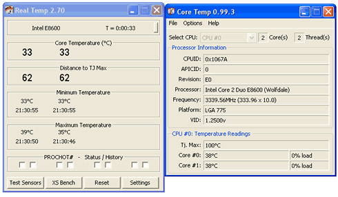 It seems to be a difference of 5 degrees Celcius between the measurements reported by the RealTemp and the CoreTemp applications. Most people tend to agree that RealTemp is better but anyway you can use both.