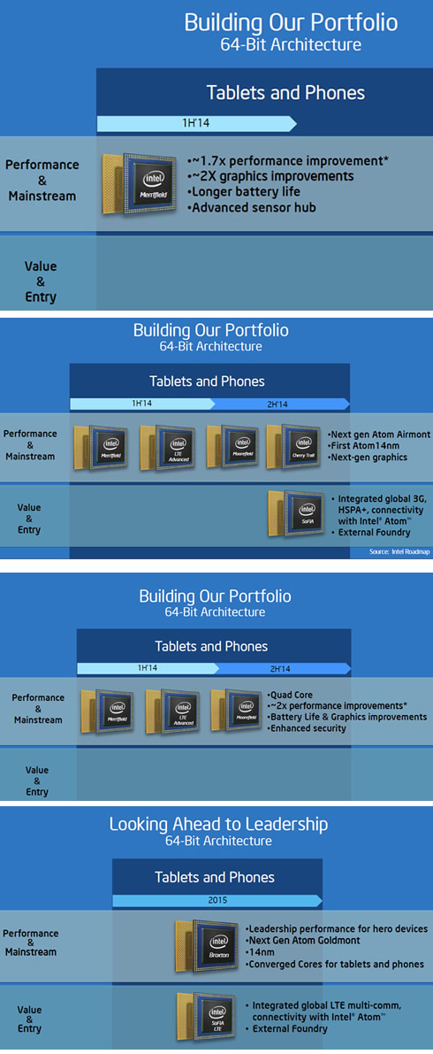 Starting from 2014, a high-performance dual-core 22nm chip code-named "Merrifield" will appear in smartphones. A quad-core variant of Merrifield will ship in the second half of next year.