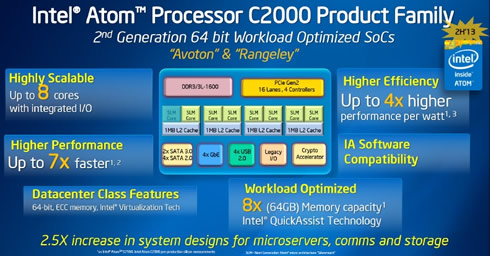 This second generation of Intel's 64-bit SoCs is expected to become available later this year and will be based on the company's 22nm process technology and the Silvermont microarchitecture. It will feature up to eight cores with integrated Ethernet and support for up to 64GB of memory.