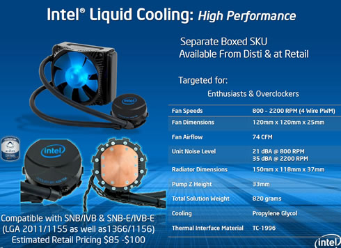 A liquid cooling solution is also available for overclocking enthusiasts. Priced at $90, it has been designed by Asetek. In this case they offer a modification with a radiator large enough for a single 120 mm fan. The cooling efficiency of this liquid-cooling system is lower than that of high-performance air-coolers so Intel's specific offering may not be so successful.