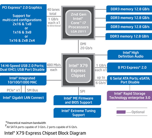 The Intel X79 Express chipset that supports this new LGA 2011 socket platform delivers 6Gb/s Serial ATA (SATA) ports and additional PCIe 2.0 lanes. The CPUs are connected to the chipset through DMI 20GB/s, The X79 Express chipset also supports USB 2.0 x 14, Gigabit Ethernet, PCI Express x1 X 8, SATA 6Gbps X 2, SATA 3Gbps X 4 and HD audio.