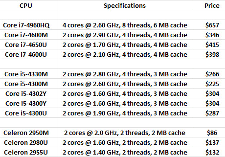 Intel also made available a dozen new (Haswell) mobile CPUs. These include a quad-core version as well as eleven dual-cores. Below you can see four Core i7 models, five Core i5s, and three Celerons: