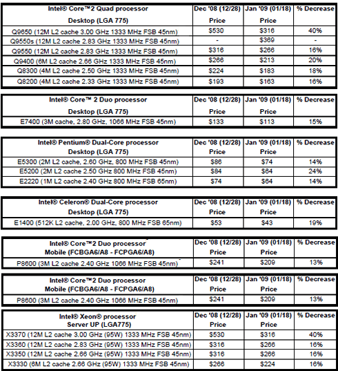 Intel announced the prices of its processors for January 2009 which include a price drop of its top-end Core 2 Quad CPU - the Q9650 - by 40 percent.
