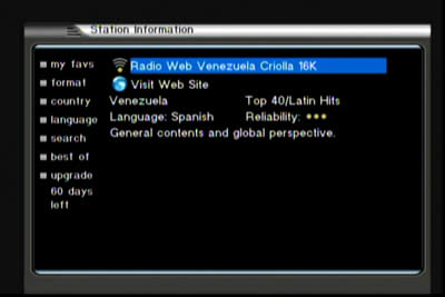 Lets select VTuner. Over a short time, the interface downloads from the Internet, a selection of online radio stations from which you can select from many different music categories. We selected the Latin Hits category and we came up with 4 stations: