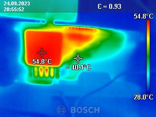 As an another test, we used a Bosch GTC400c thermal camera to take measurements of the external front/top/back shell and write down reported temperatures under full load ~ 10.00minutes after test started