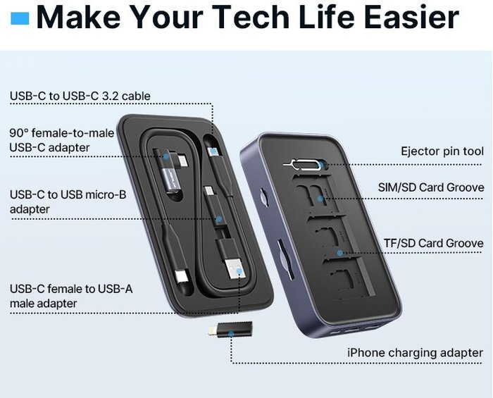 - 【 Electronic Storage Function Design】Comes with multiple types of cables and adapters, which can be conveniently taken out and connected to your devices, making your tech life easier. You will get USB-C to USB-C 3.2 cable, USB-C to USB micro-B adapter, USB-C Female to USB-A male adapter, a 90° female-to-male USB-C adapter, and an Ejector pin tool.