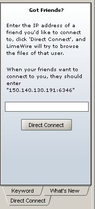 You can connect directly to a user if you know their IP address, and share your files. You can also chat with other users by clicking the right mouse button over a result file or over a file you are downloading. There is a Connections tab where you can locate and browse some ultrapeers the LimeWire uses.The LimeWire has also a built-in mp3 player for faster audio file previews. In dealing with other types of files, the LimeWire makes use of the external windows media player.