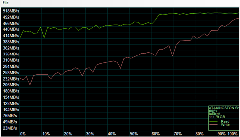 In the following graph you see how the 120GB HyperX 3K SSD - Na`Vi Edition drive reads and writes files, which have been partially of fully compressed. It is obvious that the both reading and writing speeds heavily depend on level of file compression, and are maximized when the drive deals with fully compressible data. Reading is stabilized after the 65% mark, as you see below: