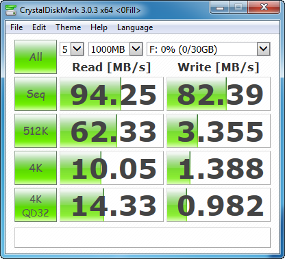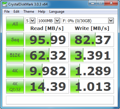 Below you see the results we got from the CrystalDiskMark benchmark with the Kingston USB 3.0 media reader plugged into the VIA USB 3.0 controller and the MicroSDHC U1 32GB flash card inserted into the reader.