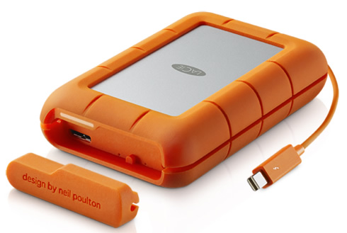 The LaCie Rugged features Thunderbolt and USB 3.0 along with two internal hard drives that are preconfigured in hardware RAID 0 for sustained performance of up to 240 MB/s.