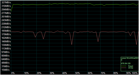 In the following graph you see how the Lexar DD512 drive reads and writes files, which have been partially of fully compressed. It is obvious that the both reading and writing speeds are pretty stable and do not depend on level of file compression.
