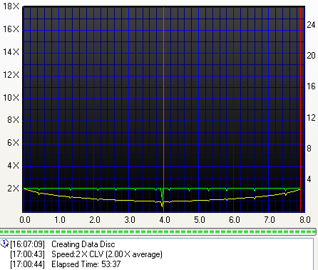 The drive started burning the media at 4.03X and maxed out at 8.06X with an average of 5.16X using ZCLV writing strategy. The burn ended after 23.20mins. Note here, that according to CDSpeed's graph, the writing speed dropped to 4X at the start of the second layer. A click on the above screen will provide a larger view of the CDSpeed graph.