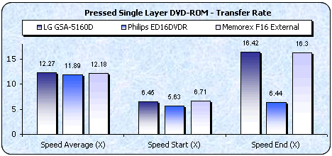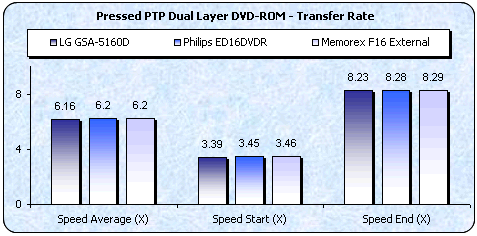 The two layers of a PTP DVD-ROM disc are read sequentially with the drive starting reading from the inner part of the disc, which is the beginning of each layer, progressing towards the outer range for each layer. The Memorex F16 was the fastest drive.