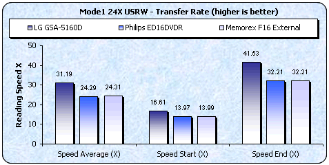 Due to the 40X max reading speed for CD media, the LG drive came last with the pressed and CD-R transfer rate tests, as the two other comparison drives support a max speed of up to 48X for the same format. In the last test though, using US-RW media, the LG drive easily reaches its higher speed, reporting the best time and maximum speed. As we can see in the above graph, in this case, both other drives, support up to 32X reading speed for US-RW.