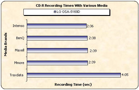 In the following graph, we can see the recording times the 5169D reported with various CD-R media inserted.