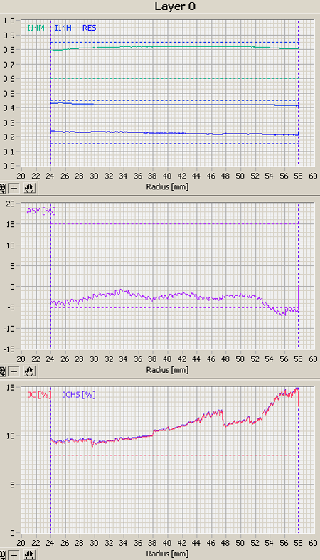 This is the first disc on this test recorded at 20x. A readable disc with uncorrectable digital errors at the end of the data area, and high PISum8 rate after the middle of the writing process.