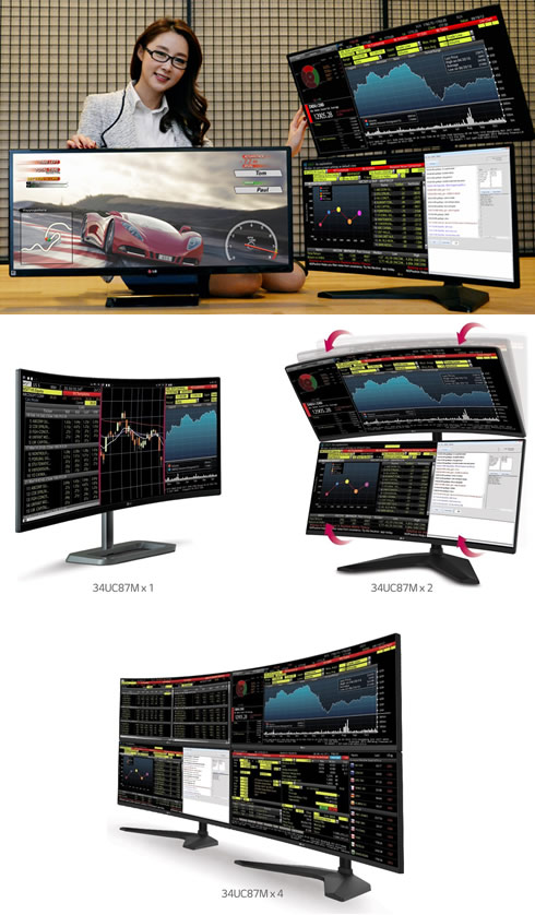 The 21:9 Curved UltraWide Multi-Display (34UC87M) provides various multiple-display set-up options. This monitor can be used as a trading workstation or a large dashboard to display charts, quotes or pending orders on each screen, allowing the user to explore a wider range of opportunities.