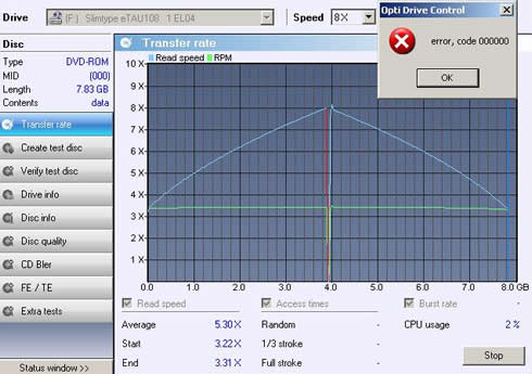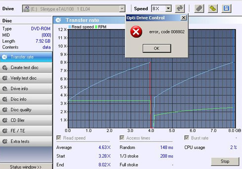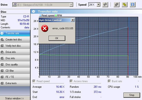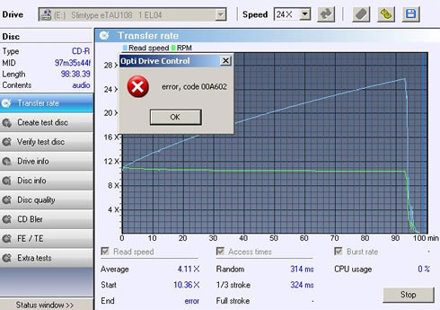 The drive could not complete the 90min audio CD reading test and the Opti Drive Control utility returned a read error in the end of the data area.