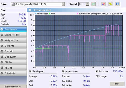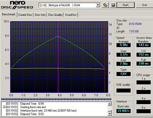 For our CD transfer rate tests, we used the Opti Drive Control and the Nero DiscSpeed benchmark utilities, as well and a set of data and audio CD-R/RW/ROM and DVD-R/+R/ROM SL/DL/+R DL/-R DL /DVD-RAM media. The drive can read CD media at a maximum speed of 24X and DVDs at 8x max.