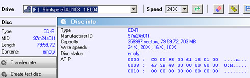 For this test (and for all ensuing tests with CD-R media), the CD-R disc was burned to its maximum capacity and at its maximum speed. Then, the same disc is read with the Disc Speed software, and the disc was scanned for digital errors (C1 and C2).