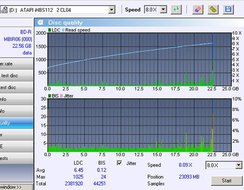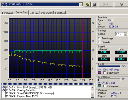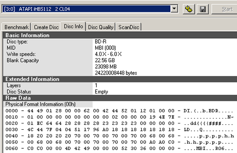 Here we used the Moser Baer BD-R SL for 6x (MBI R06) discs. According to the software, the LiteOn iHBS112 will burn the disc at 6x: