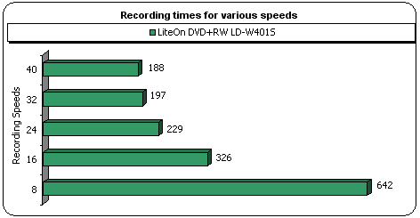 We created a 80min data compilation in Nero Burning Rom and we burned the same media brand in all available writing speeds with LiteOn. The recording times are illustrated on the below graph.