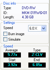 The drive burned the 6x DVD-RW media from Mitsubishi Kagaku Media (MKM 01RW6x01) in 11:01 minutes.
