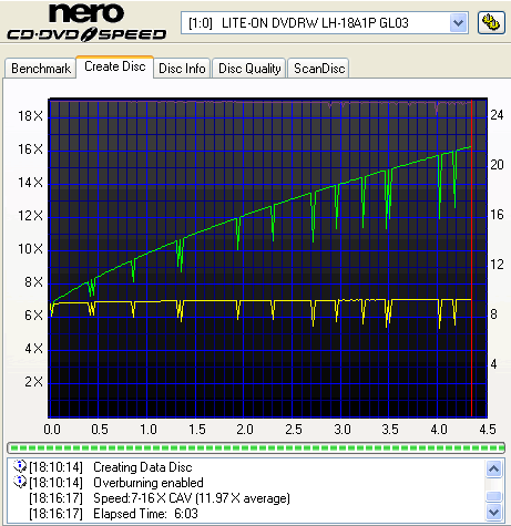 The procedure took 6:03 minutes, which is almost one minute slower than at 18x burning for DVD+R media. Actually, the 16x writing speed is a slightly slower higher due to the frequent checks by the drive's SmartBurn function (running OPC), which shows up as downward spikes in the transfer rate graph. In addition, the 16x burning process starts at 6.75x, which is lower than the 7.57x for the 18x strategy.