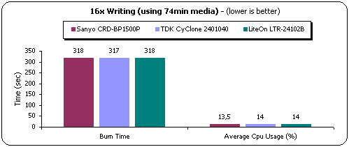 At the maximum writing speed, LiteOn LTR-24102B is around 8secs faster than Sanyo and TDK recorders. Note that this test result occurred ONLY when using a specific media type (Ricoh 74min 8X) and that with most other media the drive is equally fast to the 2 other drives (average writing time around 3:59-4:00minutes).