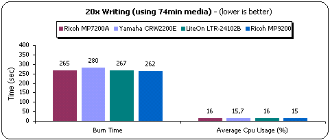 Let's see how the drives behave at 20x writing speed. The LiteOn LTR-24102B did higher recording time at 20x than the Ricoh MP7200/9200 recorders. The drive needs 267secs (4:27mins) 5 more than MP9200 and 2 more than MP7200. The CPU Usage is the same levels as the competition does.
