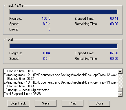 We then tried to extract all wav files with the Plextor PX-716A and PlexTools DAE Error Correction 5th Level enabled: