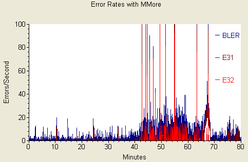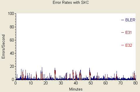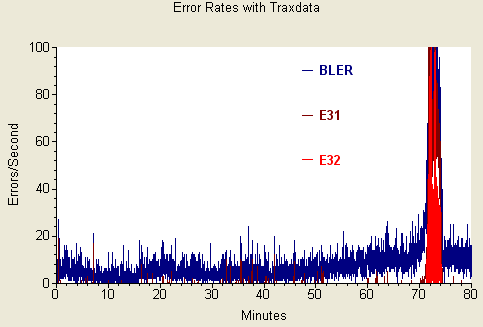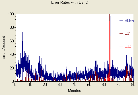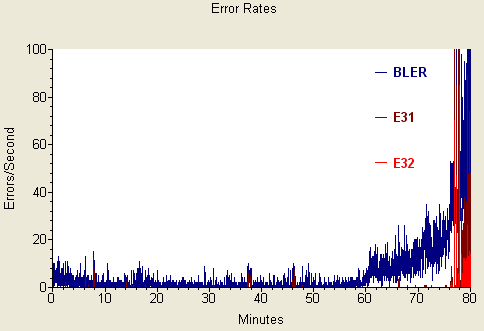 BLER (Block Error Rate) is defined as the number of data blocks per second that contain detectable errors, at the input of the C1 decoder. Since this is the most general measurement of the quality of a disc, you will find BLER graphs for all media tested below. If you click on the images you can see a more detailed table, indicating error levels. The Red Book specification (IEC 908) calls for a maximum BLER of 220 per second averaged over ten seconds. Discs with higher BLER are likely to produce uncorrectable errors. Al low BLER shows that the system as a whole is performing well, and the pit geometry is good. However, BLER only tells us how many errors were generated per second, and it does not tell us anything about the severity of those errors.