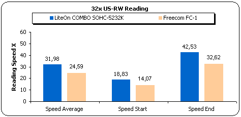 Both LiteOn and Freecom drives support 52x32x52 speeds. However they had different speed in CD-RW media reading. So, as it can been seen from the graph above, LiteOn was faster than Freecom, since the speed was 40x for SOHC and 32 for FC-1.