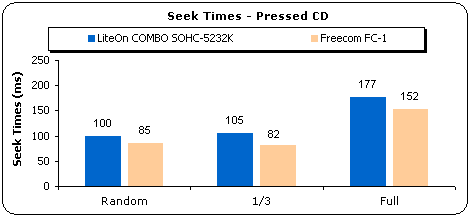 LiteOn was somewhat slower that the Freecom recorder in the seek time test, especially in the full seek where SOHC needed 177ms. But despite the fact that SOHC was slower than FC, 177ms is a good score for a combo drive.