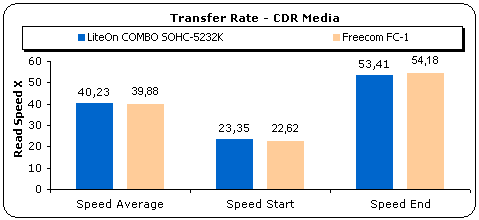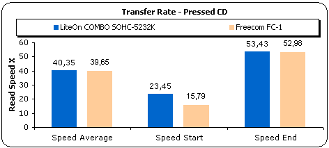 In the pressed CD reading test, LiteOn SOHC 5232K brought marginally equal results with the Freecom FC-1 drive except the starting speed where SOHC started the reading at a higher speed. With a final speed of 53,43x, the LiteOn drive overreach the manufacturers specifications for 52x reading.