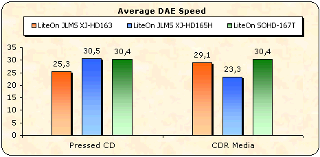 The LiteOn SOHW-167T supports up to 48X CAV DAE speed. When using a pressed AudioCD and its CD-R copy, with EAC, we logged the following results: