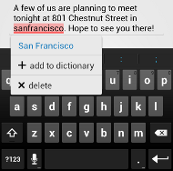 To fix misspelled words more easily, Android 4.0 adds a spell-checker that locates and underlines errors and suggests replacement words. With one tap, users can choose from multiple spelling suggestions, delete a word, or add it to the dictionary. Users can even tap to see replacement suggestions for words that are spelled correctly. For specialized features or additional languages, users can now download and install third-party dictionaries, spell-checkers, and other text services.