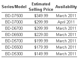 The 2011 line offers built-in support for Dolby True HD across the full lineup; DTS-HD is also integrated in the BD-D6500 and higher.
