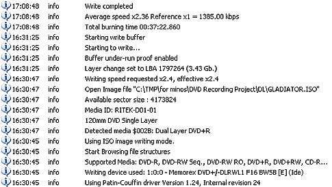 We burned two DVD+R DL discs with DVD-Video content. The source disc was "Gladiator Movie - Special Edition" disc1 with a total size of 6.86GB. First, we transferred the movie to the hard disc with DVD Decrypter in ISO format (single file). Afterwards, we used CopyToDVD v3.0.0.26. After choosing the "GLADIATOR.ISO" image we selected the Memomrex F16 burner.